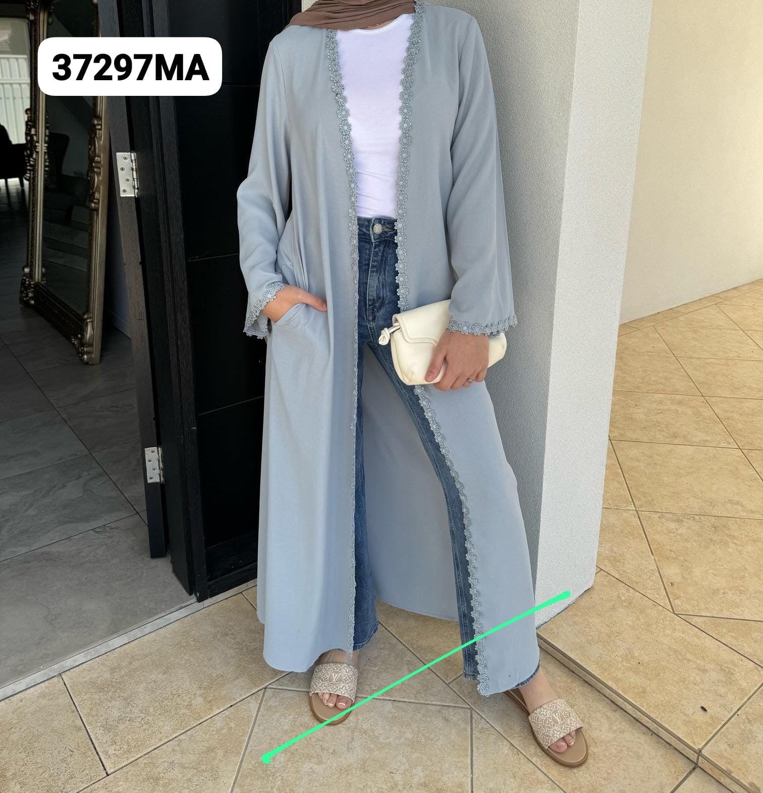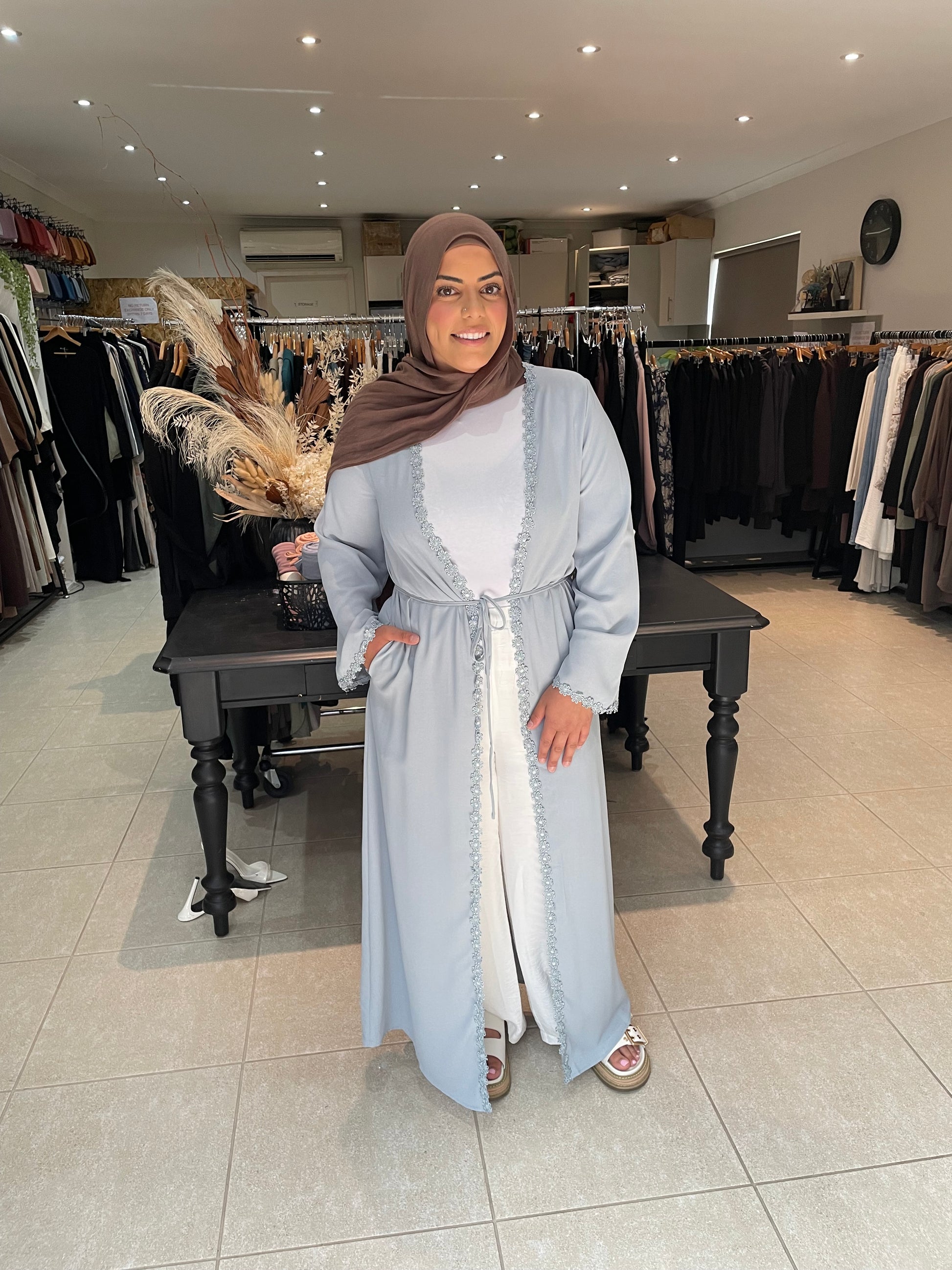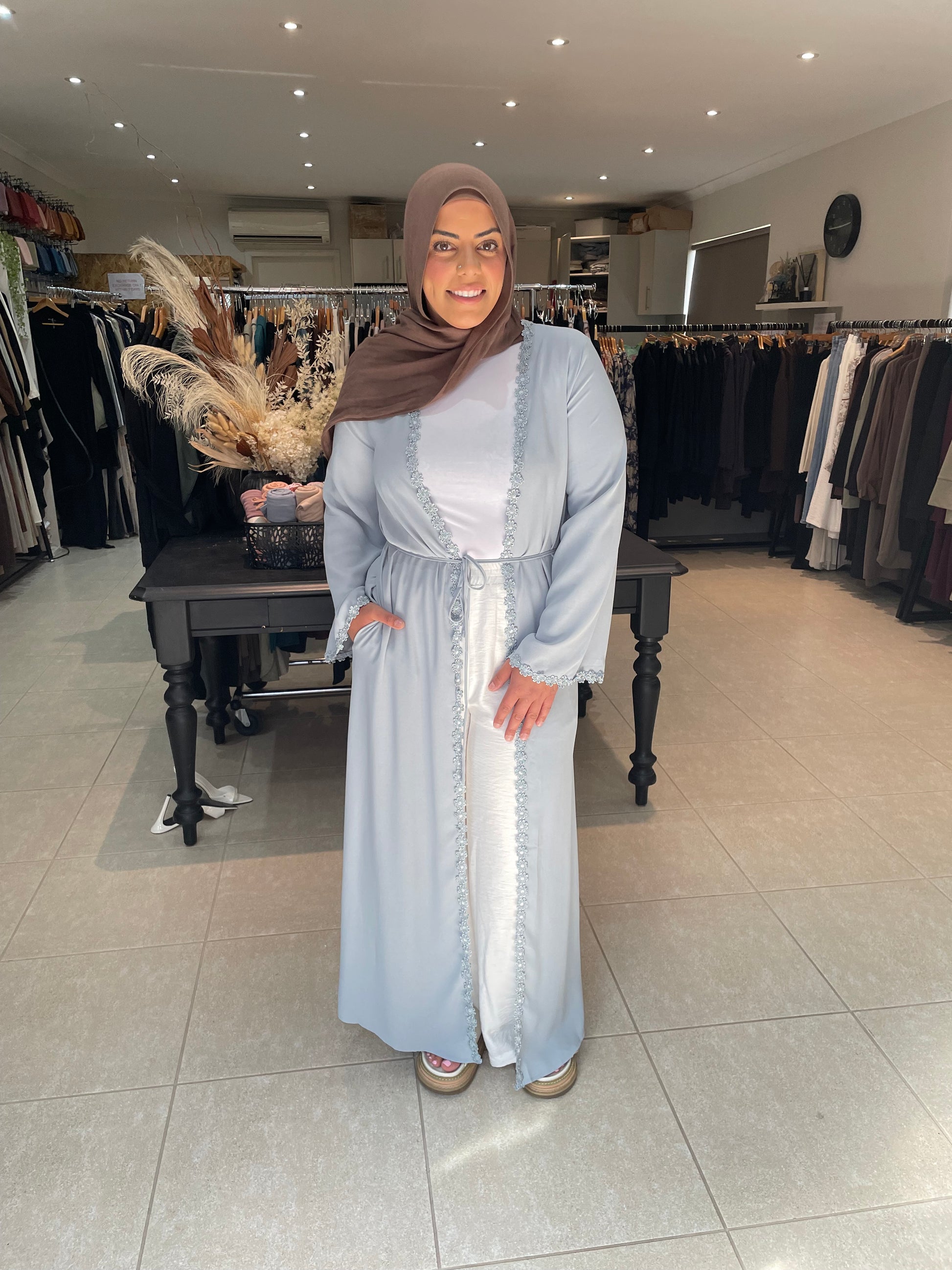 Sky blue Kimono with flower embroidery along the front and sleeves. side pockets