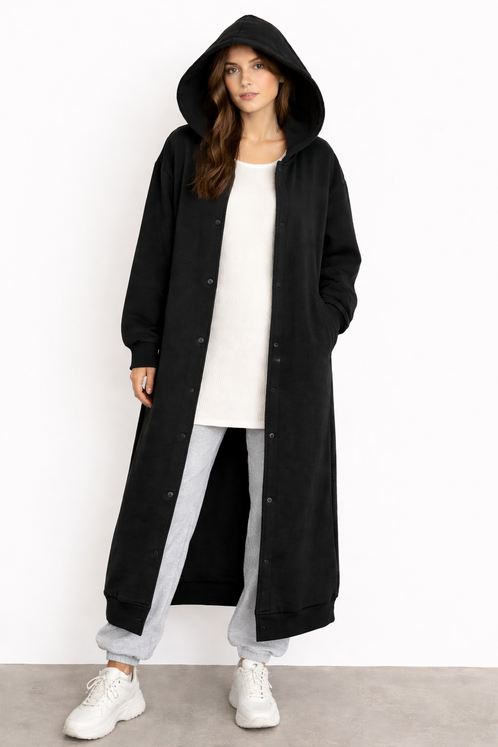 Elevate your everyday style with this effortlessly chic longline hooded jacket. Designed with a relaxed, oversized fit, this piece features a full snap-button front, functional side pockets, and a cozy hood for added comfort. The soft, premium fabric makes it perfect for layering through all seasons, while the ankle-length cut adds a modest and modern touch. Style it over your casual sets or dress it up for a clean, minimal look.