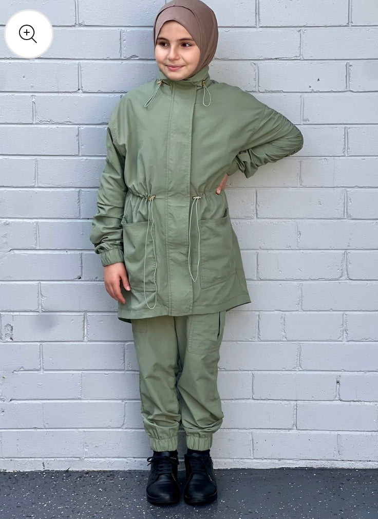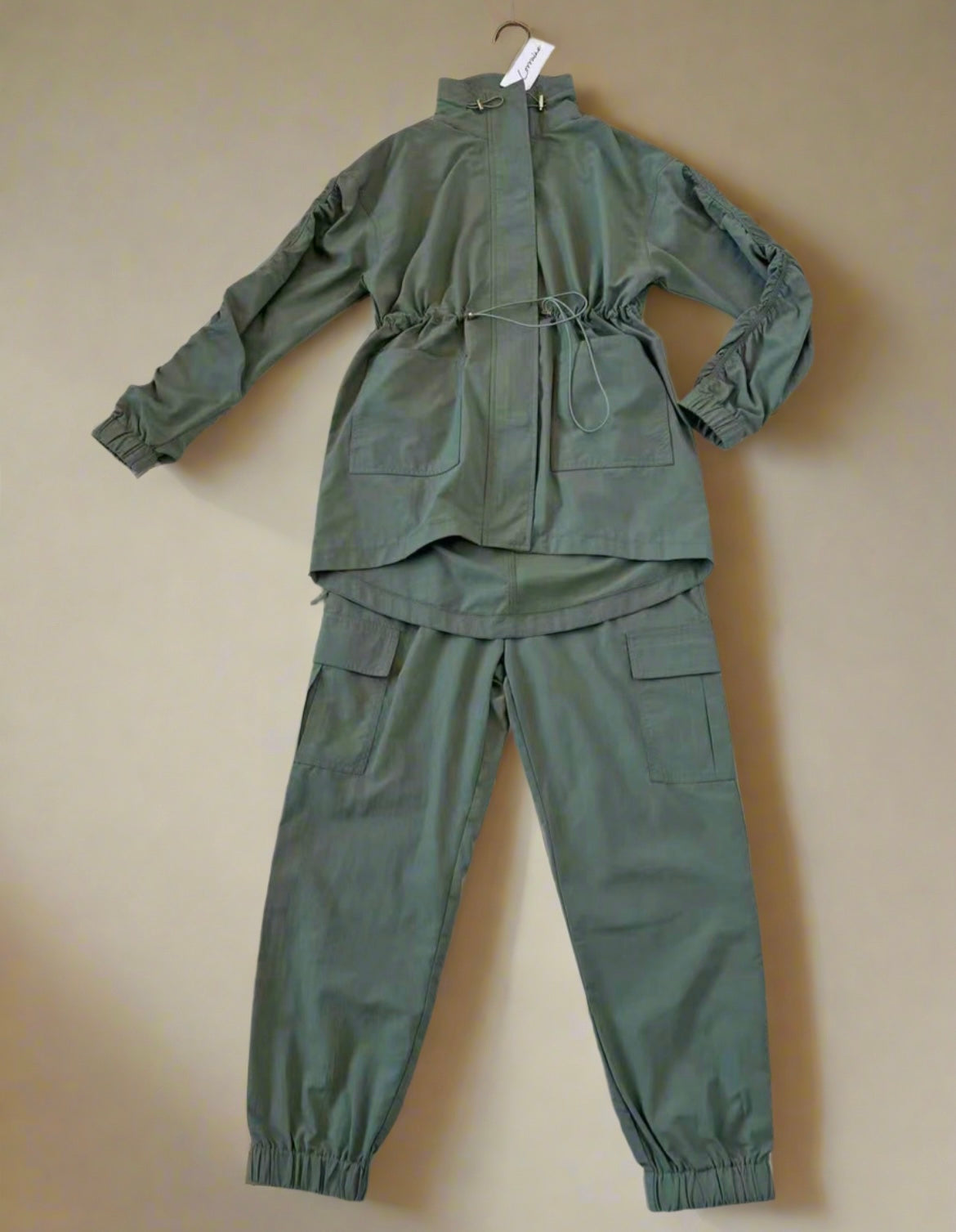 Top features zip closure, stud button overlay cover over the zip, side pockets, gathering on the arm and a high low hem. Pants have an elastic waist with draw string, side pockets and cuffed hem.