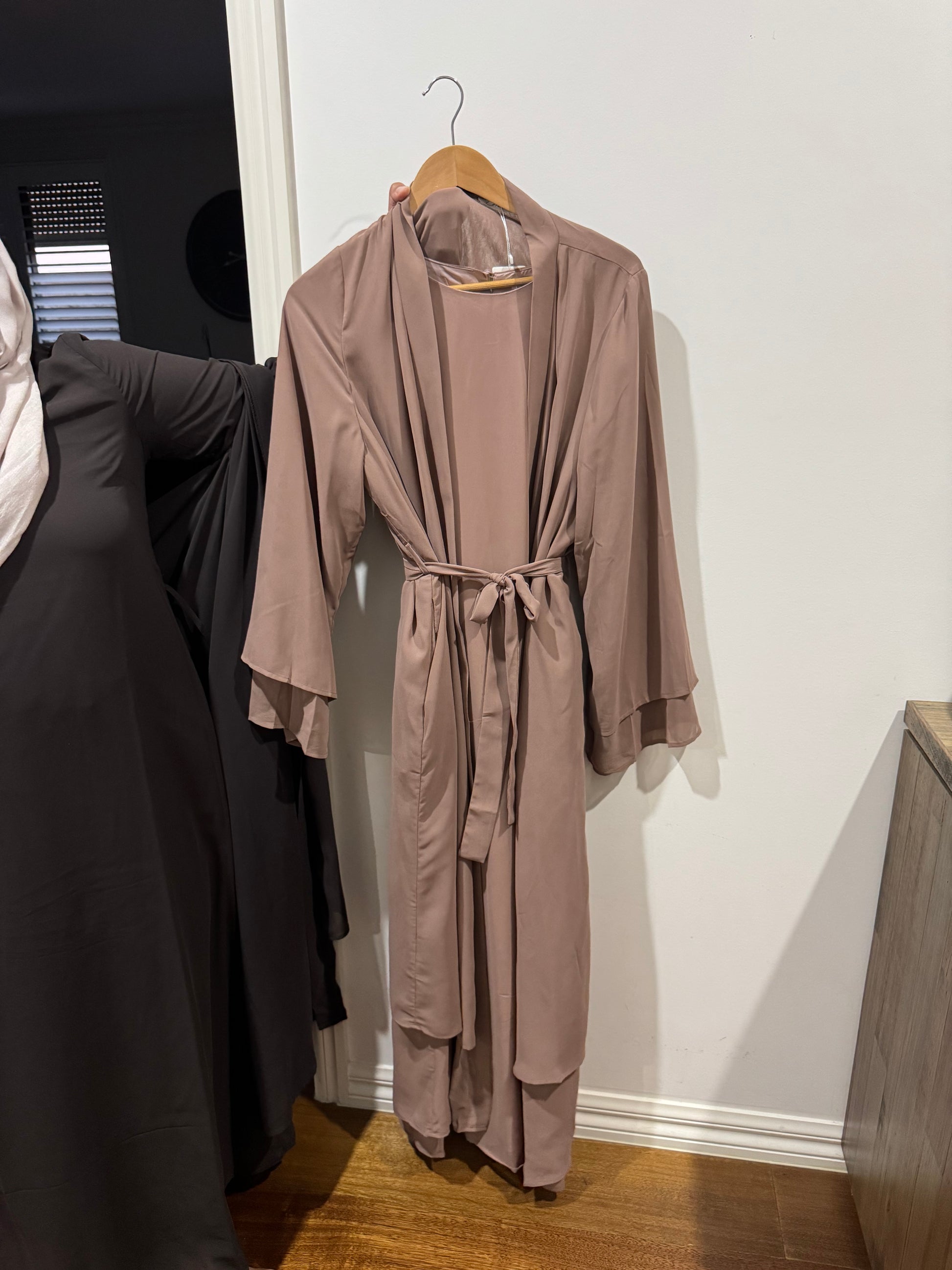 A timeless modest ensemble in a rich chocolate tone, olive and Mauve, designed for effortless elegance and everyday sophistication. This flowing two-piece set features a soft inner dress layered with a lightweight open-front outer robe, creating beautiful movement with every step. The adjustable waist tie allows for a flattering, custom fit while maintaining a relaxed silhouette. Finished with wide sleeves and functional side pockets, it blends practicality with refined style.