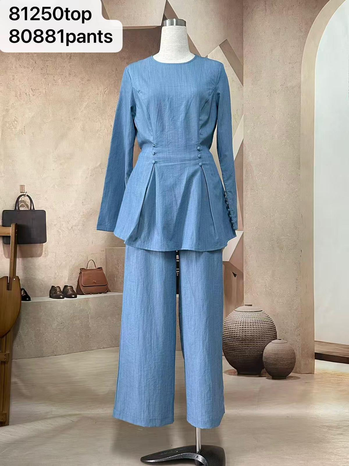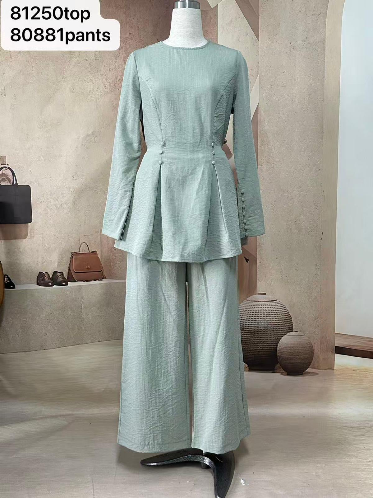 This beautifully coordinated two-piece set combines effortless style with everyday comfort. Featuring a long-sleeve top designed with a softly structured waist and subtle button detailing, it creates a flattering, feminine silhouette. Paired with matching wide-leg pants, the set is crafted from a fabric that moves with ease. Perfect for casual days, workwear, or elevated everyday styling.