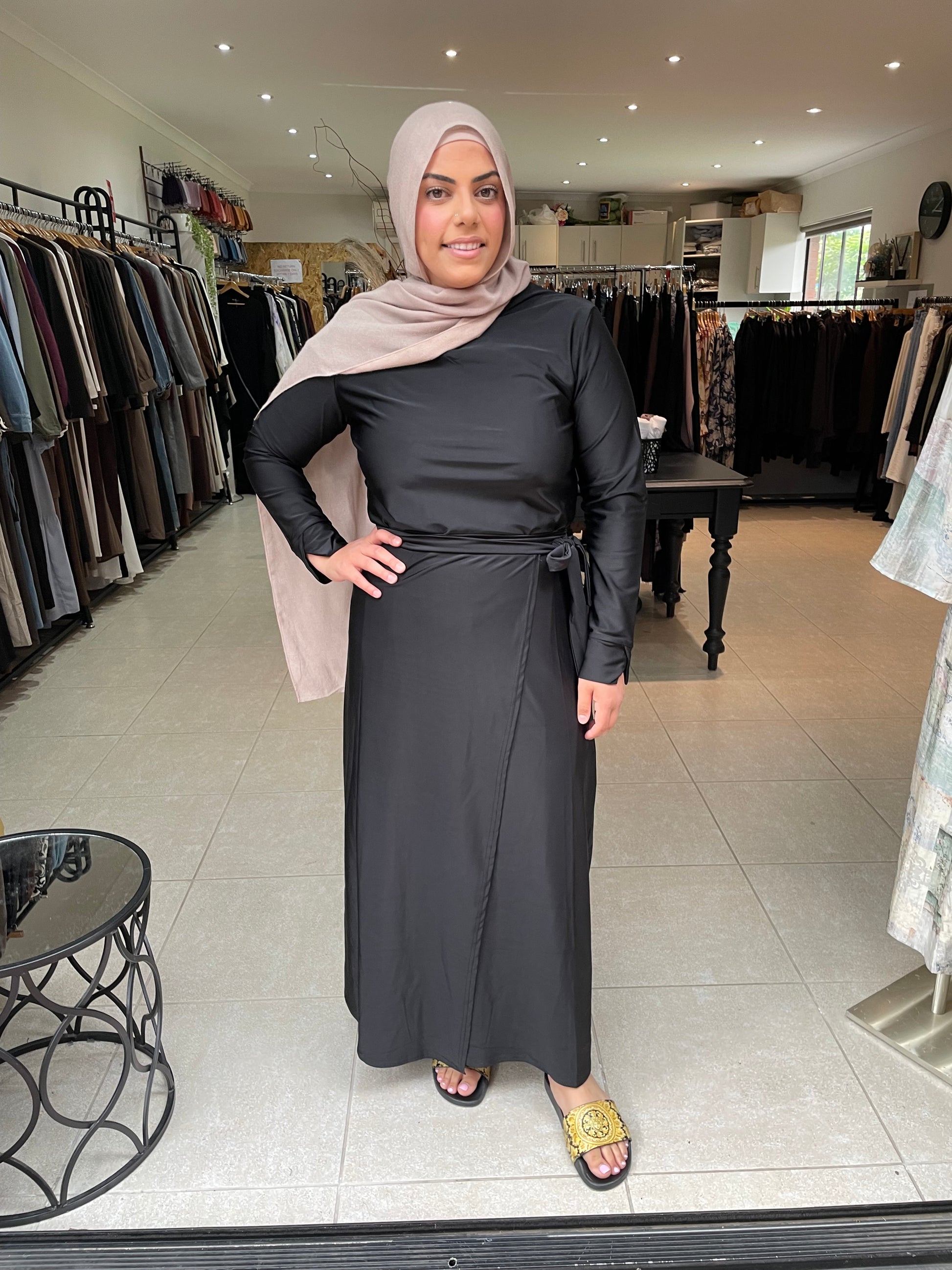 Three piece swim set. Long modest top which sits below the knee (midi length) tights and a sarong.