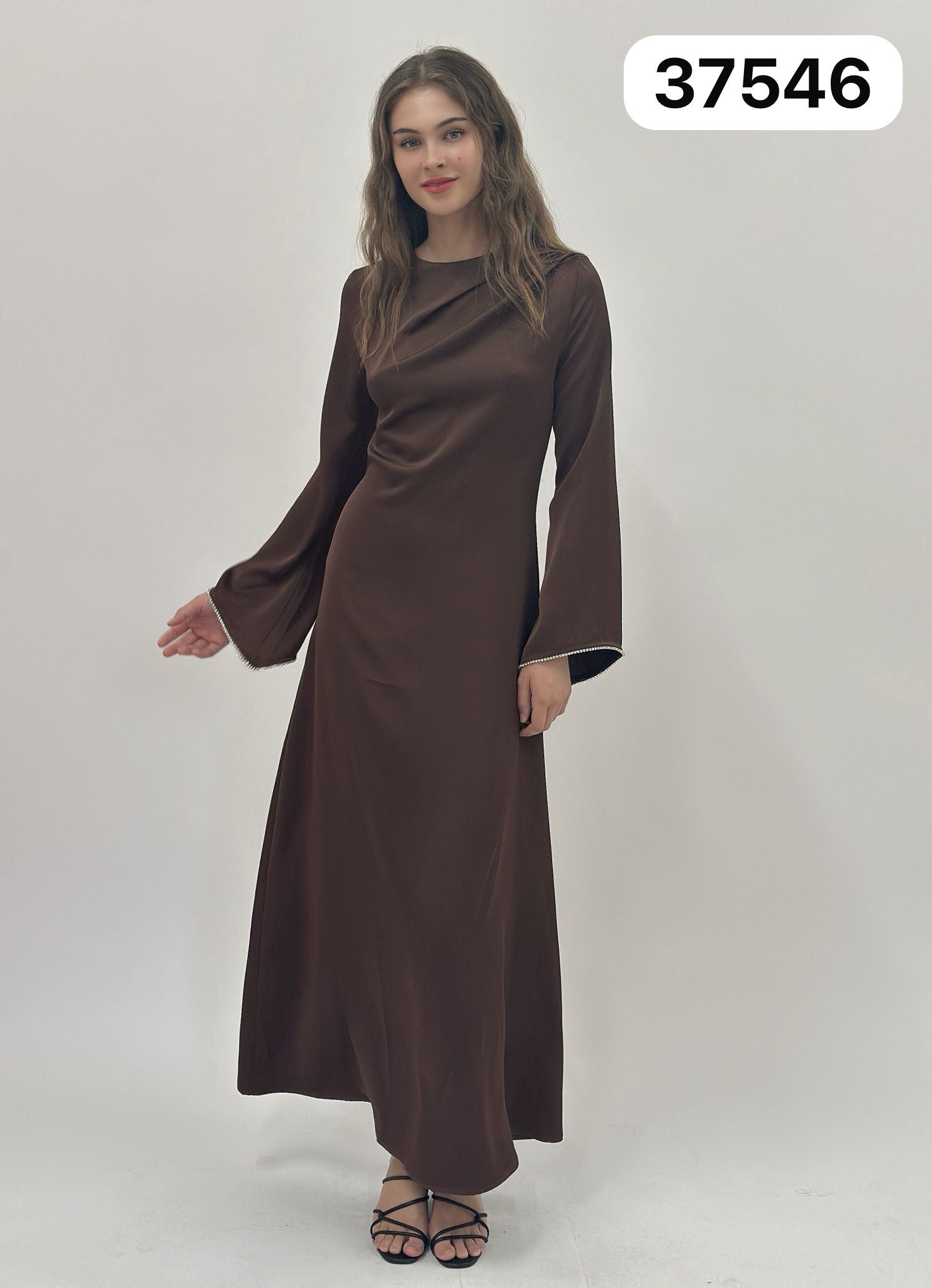 Elegant and effortlessly modest, this chocolate brown maxi dress is designed with a soft draped neckline that adds a refined touch to its clean silhouette. Crafted from a smooth, fluid fabric, it falls gracefully to the ankles, creating a flattering elongated shape while maintaining full coverage.