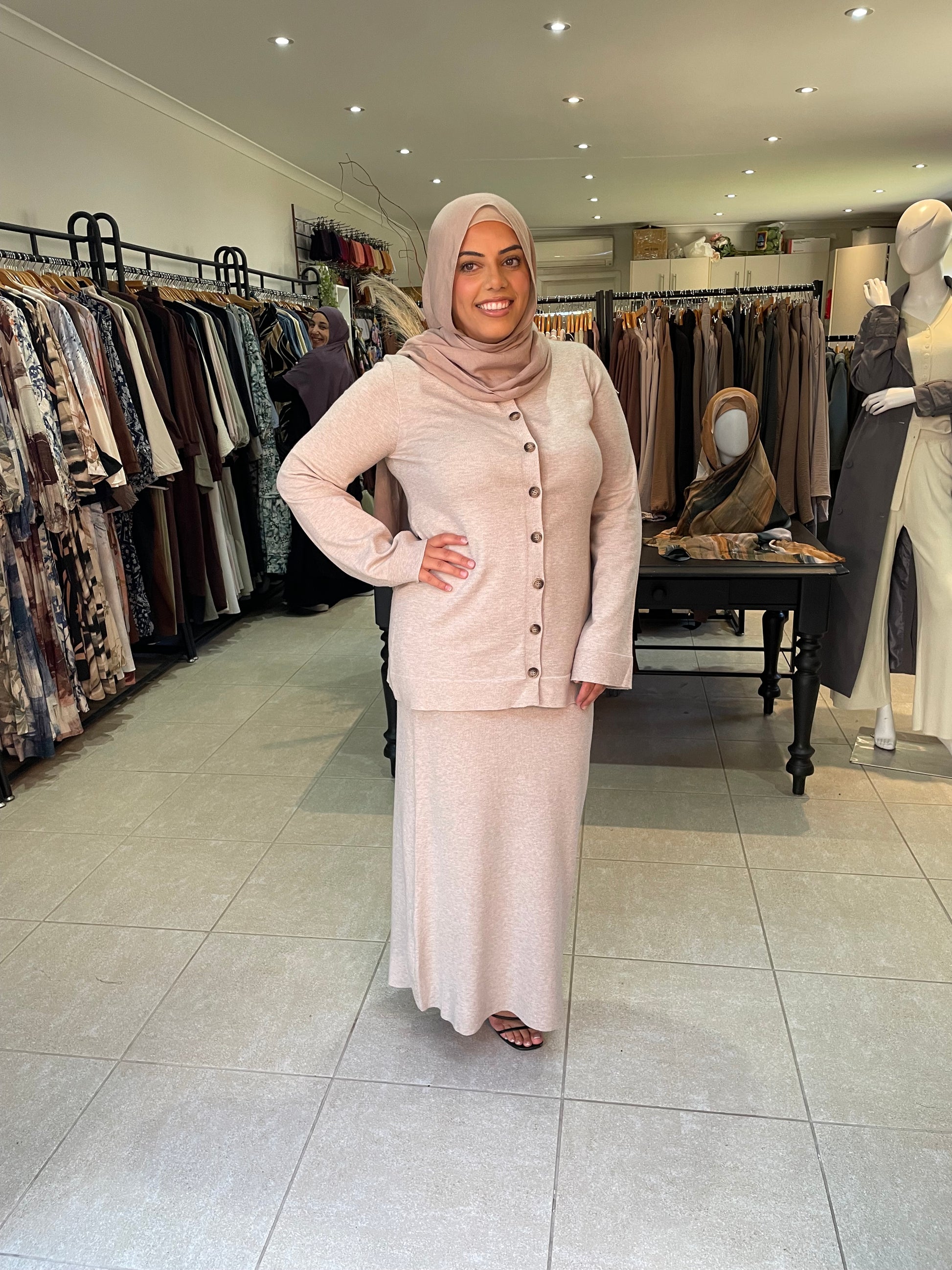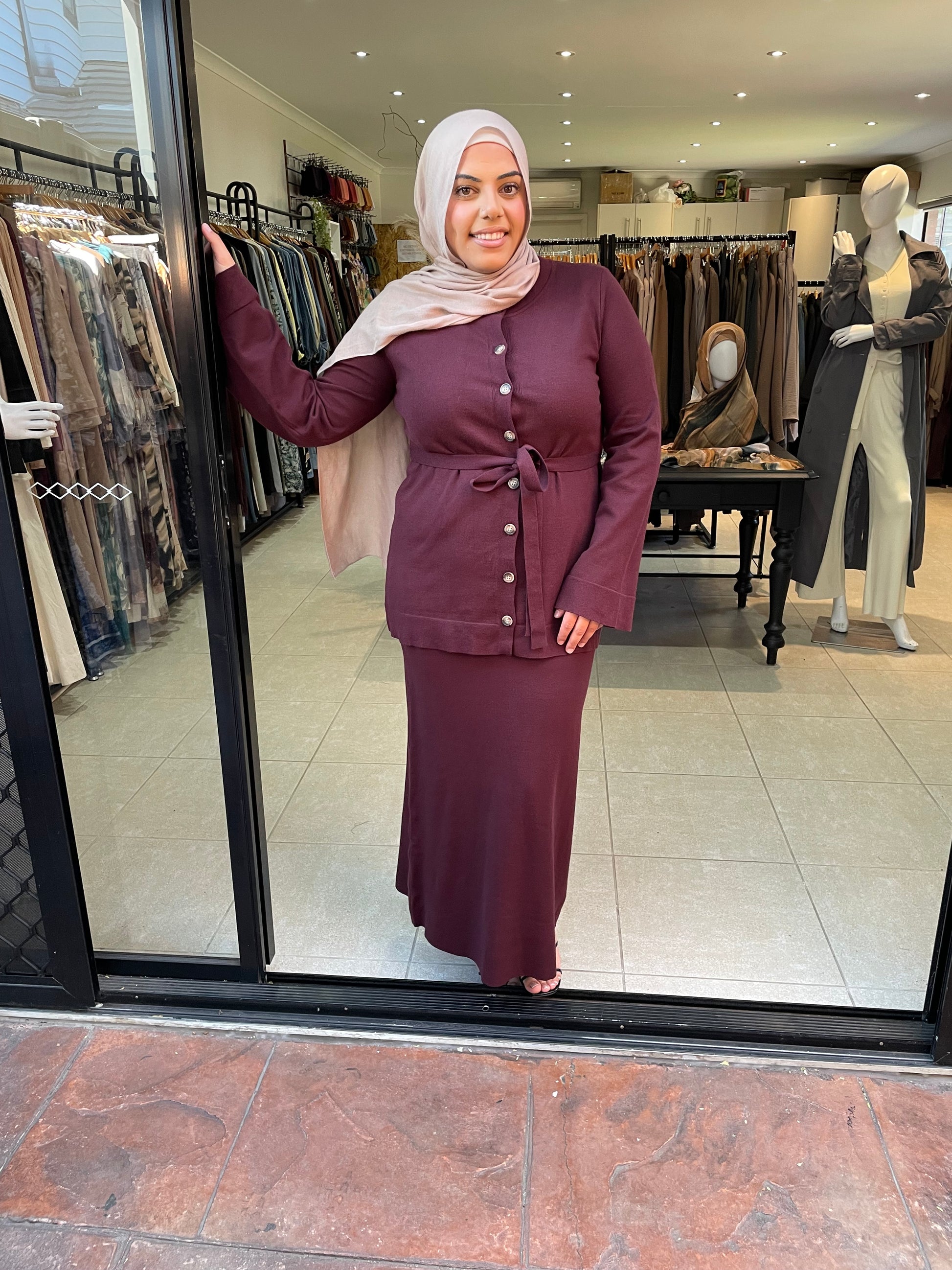 Keep warm this autumn with this soft touch knit set, button through front, tie at waist and elastic on the skirt waist line.